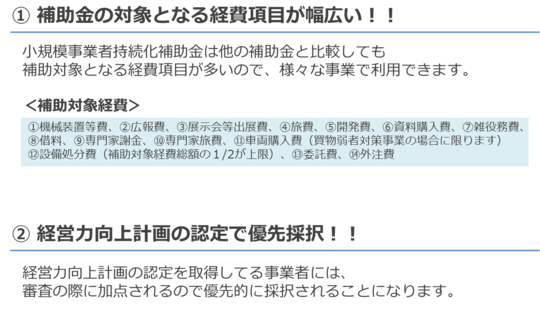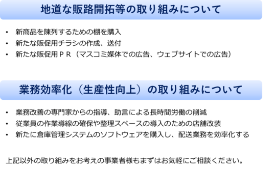 経営計画を作成し、その計画に沿って取り組む販路開拓等の経費の一部が補助されます。